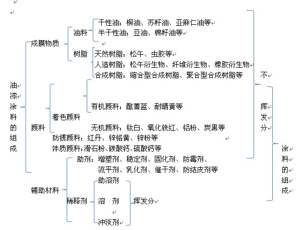 涂料的組成如下表所示。從表的左邊看,涂料由成膜物質(zhì)、顏料和輔助材料三部分組成。從表的右邊看,涂料由揮發(fā)分與不揮發(fā)分兩部分組成。上述情況并非矛盾。因?yàn)檩o助材料里面有不揮發(fā)的固化劑、防霉劑等,同時(shí)也有屬于揮發(fā)分的稀釋劑等。